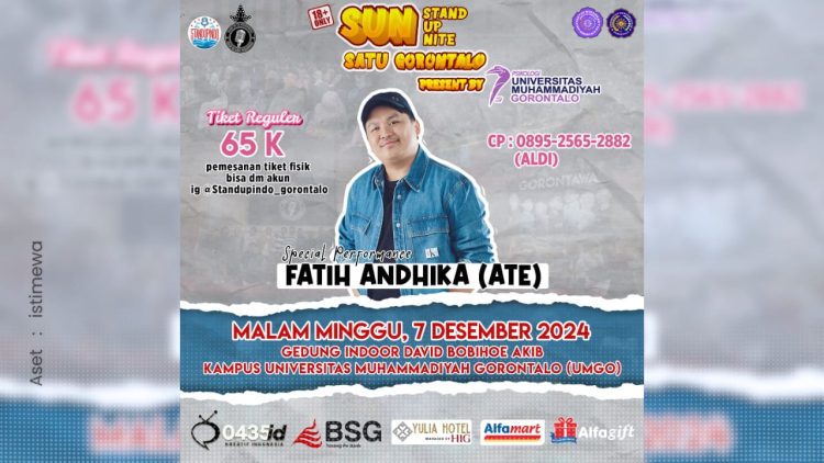 Autentik.id, Hiburan – Fatih Andika (Ate) bakal tampil dalam show stand up comedy terbesar pertama di Gorontalo bertajuk “Stand Up Nite 1 Gorontalo” yang akan digelar 7 Desember 2024 di Indoor David Bobihoe Akib, Kampus Universitas Muhamadiyah Gorontalo.