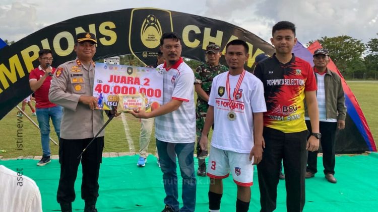 Penutupan turnamen tersebut menjadi momentum apresiasi bagi para tim terbaik yang telah menunjukkan semangat juang tinggi di lapangan. Salah satu momen puncak adalah penyerahan hadiah kepada tim PS Popayato, yang sukses menempati posisi runner-up. Penghargaan diserahkan langsung oleh Kapolres Pohuwato, AKBP Busroni, S.I.K., M.H., berupa uang tunai sebesar Rp40 juta.